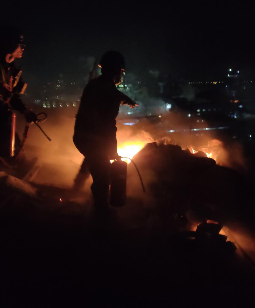 3月26日21:50,200脫硫脫硝巡檢員劉璐和雷恒在催化劑層進(jìn)行檢修作業(yè),發(fā)現(xiàn)遠(yuǎn)方265脫硝頂部有火光,隨即向當(dāng)班班長王煜軒匯報(bào)并立即攜帶滅火器材趕往265,經(jīng)確認(rèn)是項(xiàng)目施工隊(duì)遺留在脫硝頂部的編織袋和保溫棉著火。